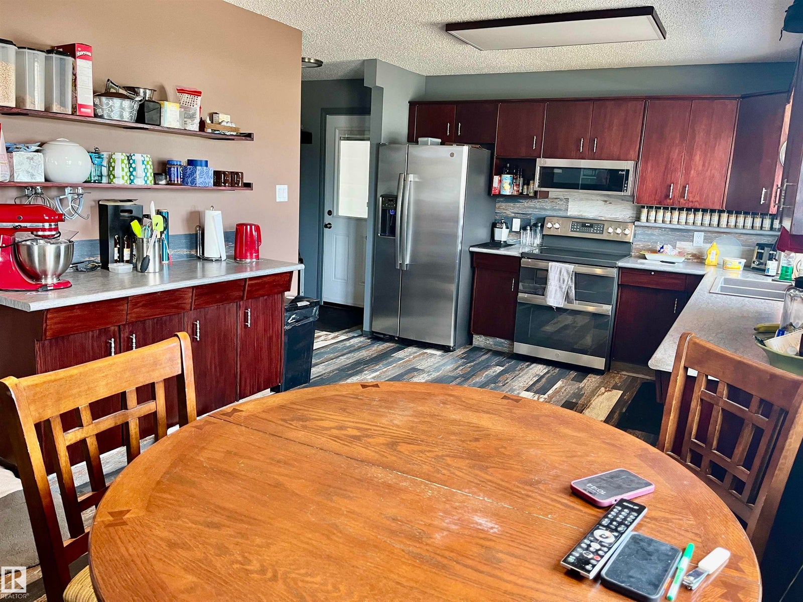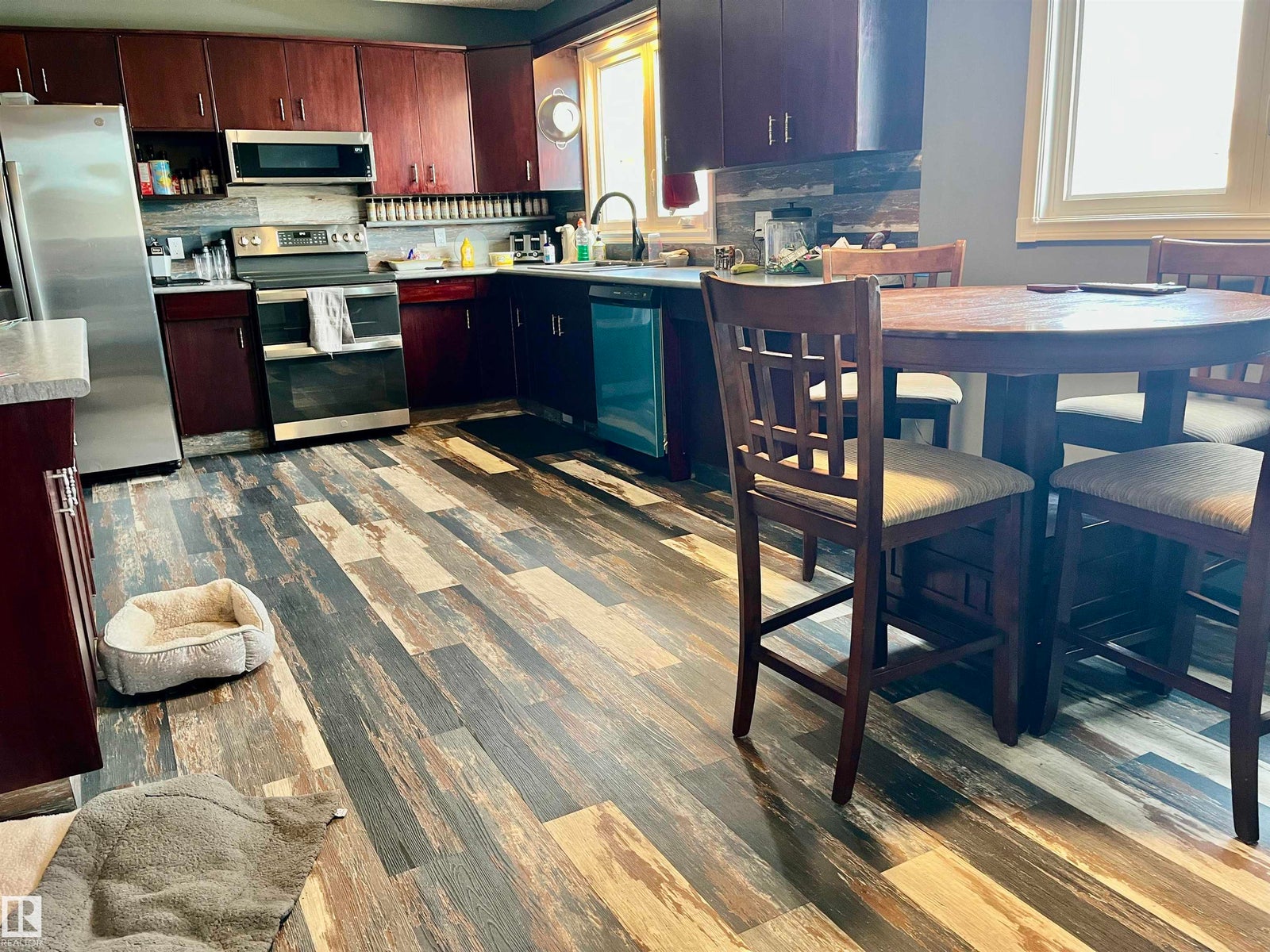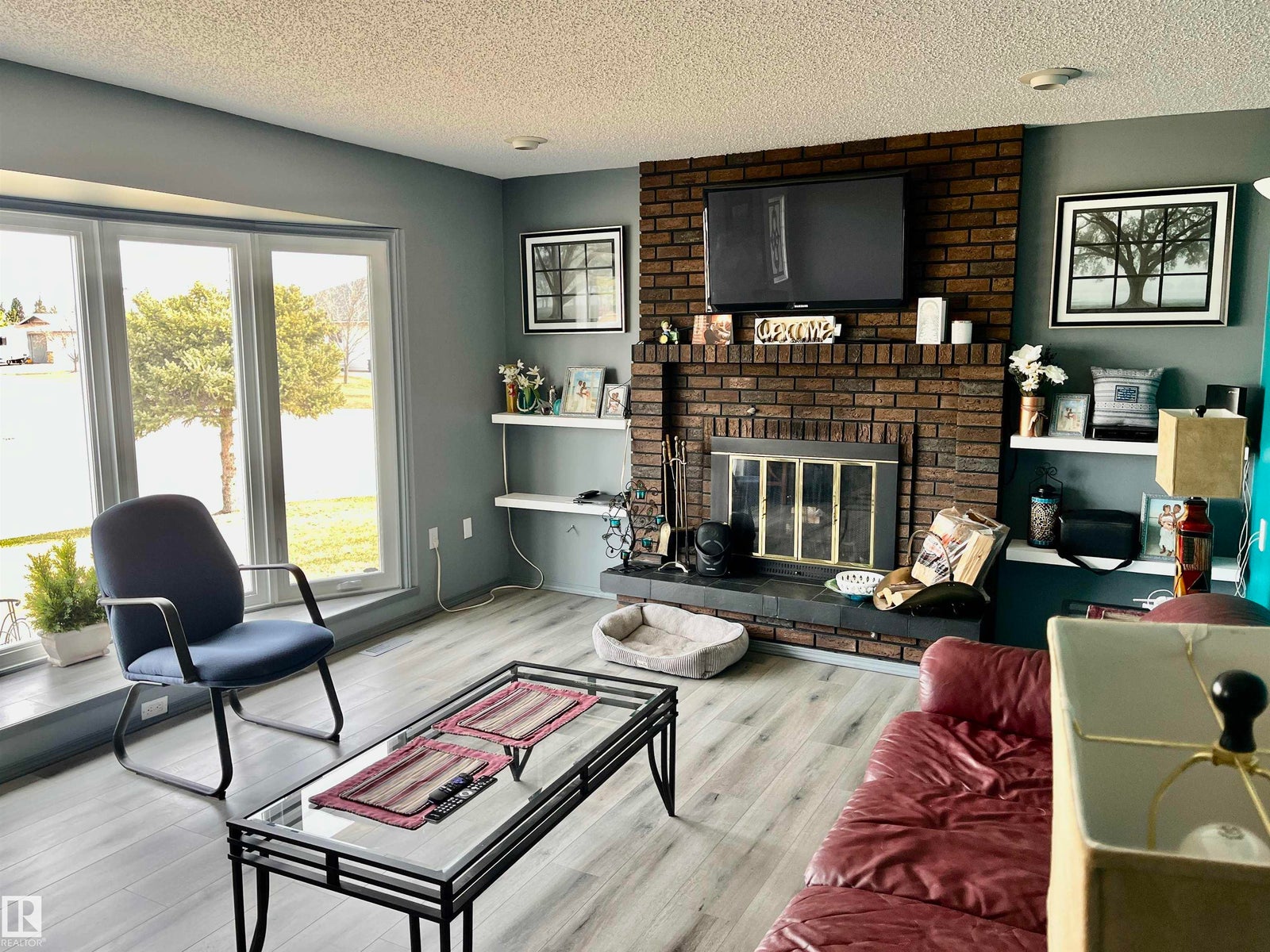 WHAT A LOVELY HOME!! BOASTING 3 bedrooms & 3 bathroom Bungalow on a large corner lot in Smoky Lake.. So Many Upgrades: in 2024 new flooring, appliances. - 2023, air conditioning, new bath room (with huge tub), maintenance free deck. - 2022 - All new windows, furnace, hot water tank, the breeze way enclosed with new doors and new garden shed in back yard. Main floor laundry, nice open kitchen/dining area and spacious living room with fireplace. Basement has an enormous rec. room , utility room, bedroom, bathroom, and cold storage. Fully fenced yard and plenty parking. With Golf 2 miles away.. Just Unpack and Enjoy! Close to School, Parks, and Hospital...